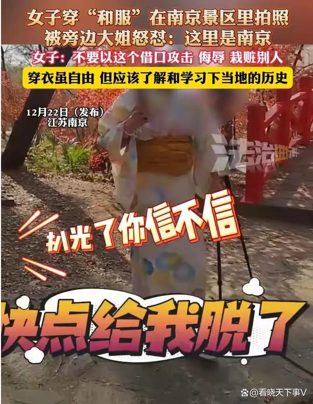视频显示,事发地点在中山植物园内,现场有多名游客在拍照,但该女子所穿的和服明显格格不入。大姐看到这一幕,气不打一处来,怒道:你甚至不是来自中国!这里是南京好吗?你怎么想呢我想问,你上过学吗你花了九年的时间买了这本书”